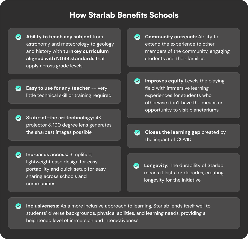 More than just cutting-edge technology, Starlab is an initiative to build the scientific literacy skills students will need in the future, empower them with experiences that widen their perspective, and deepen their learning in ways that can help close learning gaps. What’s more, Starlab is an initiative that demonstrates a clear commitment to expanding programming and access to science education for all students.